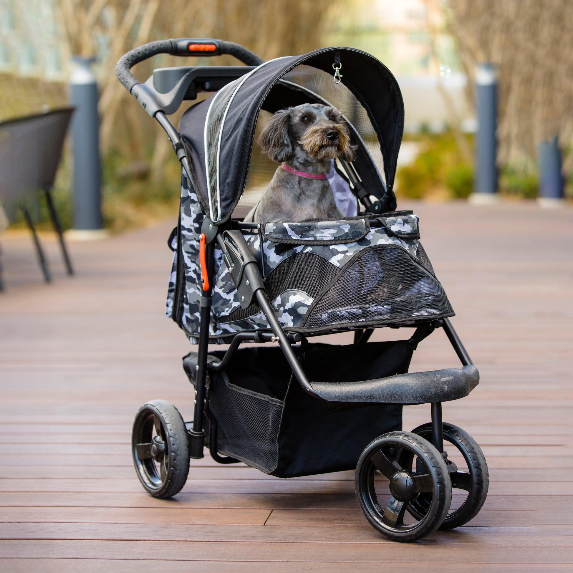 PetiqueのDurable Pet Stroller(デュラブル ペットストローラー)は、厚いフレーム、大きなEVAタイヤ、ダブル前輪でとても頑丈に作られており、犬や猫、その他の動物を散歩させる際にスムーズで楽しい乗り心地を実現します!