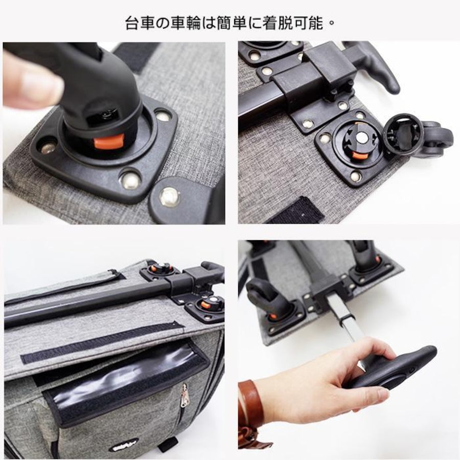 一般的な手提げキャリーやショルダーキャリーに加え、着脱可能な台車をセットすることでコロコロキャリーにもなる便利な3WAY仕様です。